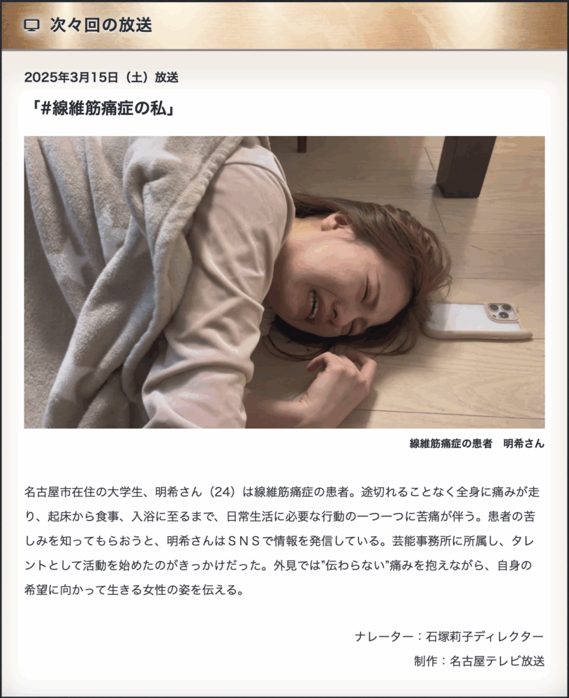 2025年3月15日(土)早朝4時50分から放送されるテレビ朝日のテレメンタリーにて「線維筋痛症の私」が放映されます。 当院での診察風景も放映される予定となっております。ご興味のある方は、ぜひご覧ください。